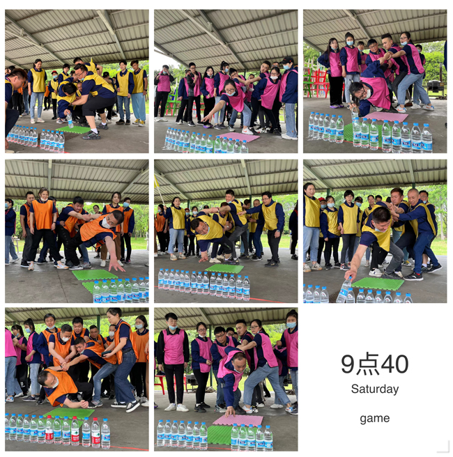 這個(gè)游戲的規(guī)則是每個(gè)隊(duì)一個(gè)圓圈,每個(gè)隊(duì)員都要穿過這個(gè)圓圈,看那個(gè)隊(duì)用時(shí)最短,每個(gè)隊(duì)都奮力爭(zhēng)先。眾人齊心協(xié)力,心向一處靠,力往一處使。團(tuán)隊(duì)協(xié)作精神體現(xiàn)的淋漓盡致。